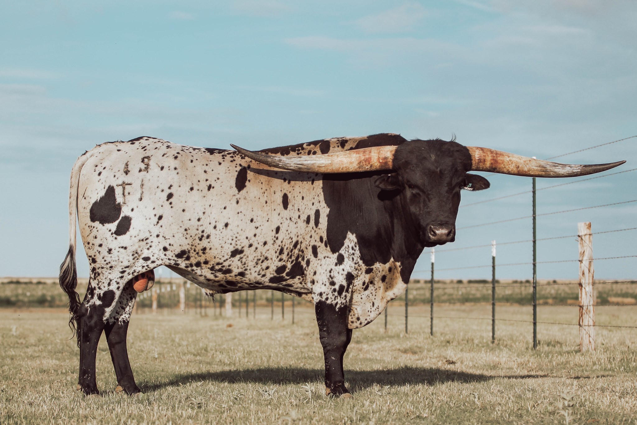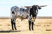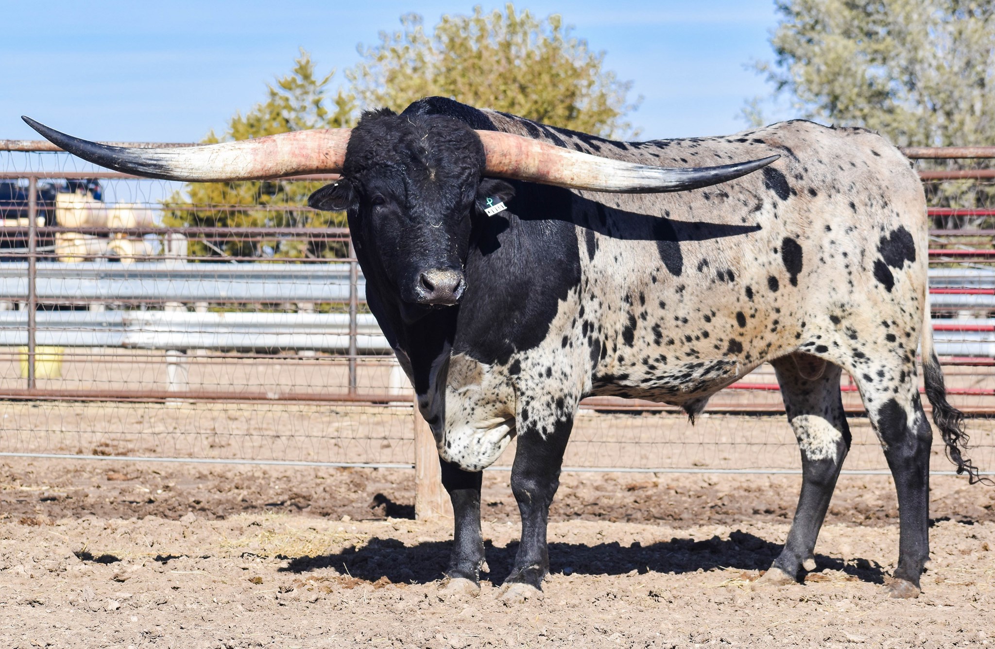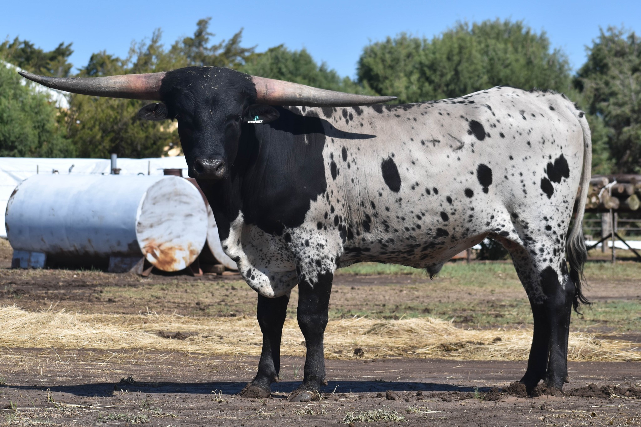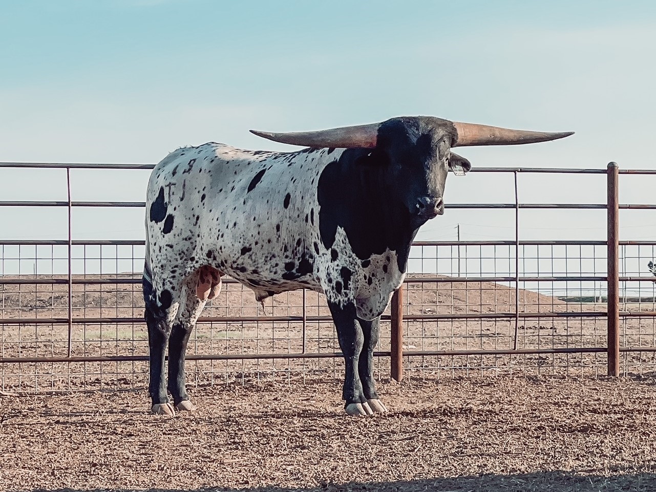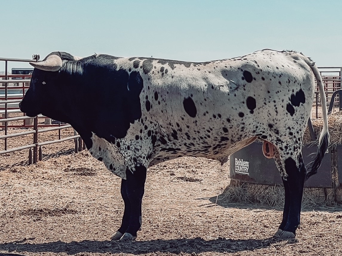 Multi Grand Champion Futurity Winner including first place in his class at Legends 2023 and the Millennium Futurity 2023 as well as the 2023 HSC Grand Champion. He was the Grand Champion Bull at Legends 2024 winning himself a trailer and voted People's Choice bull going out with a bang for his last futurity ever. One of the youngest true black bulls to hit 90" TTT at 39 months His first offspring are tall, beefy, and colorful even throwing a homozygous black bull. Jest a Cowboy is a flashy black and white, multi Grand Champion winning bull with a stellar pedigree starting with his parents, Tuff Cowboy DC who is over 100" TTT and his dam, Jest Dragging Iron a flashy black and white who reached the 90" mark herself with a gorgeous twist and currently one of the largest horned true blacks in the industry. Those genetics also bring in Cowboy Tuff Chex, Drag Iron, and Overkill. With excellent conformation, height, and horn growth, His first calves are hitting the ground and they are incredible.