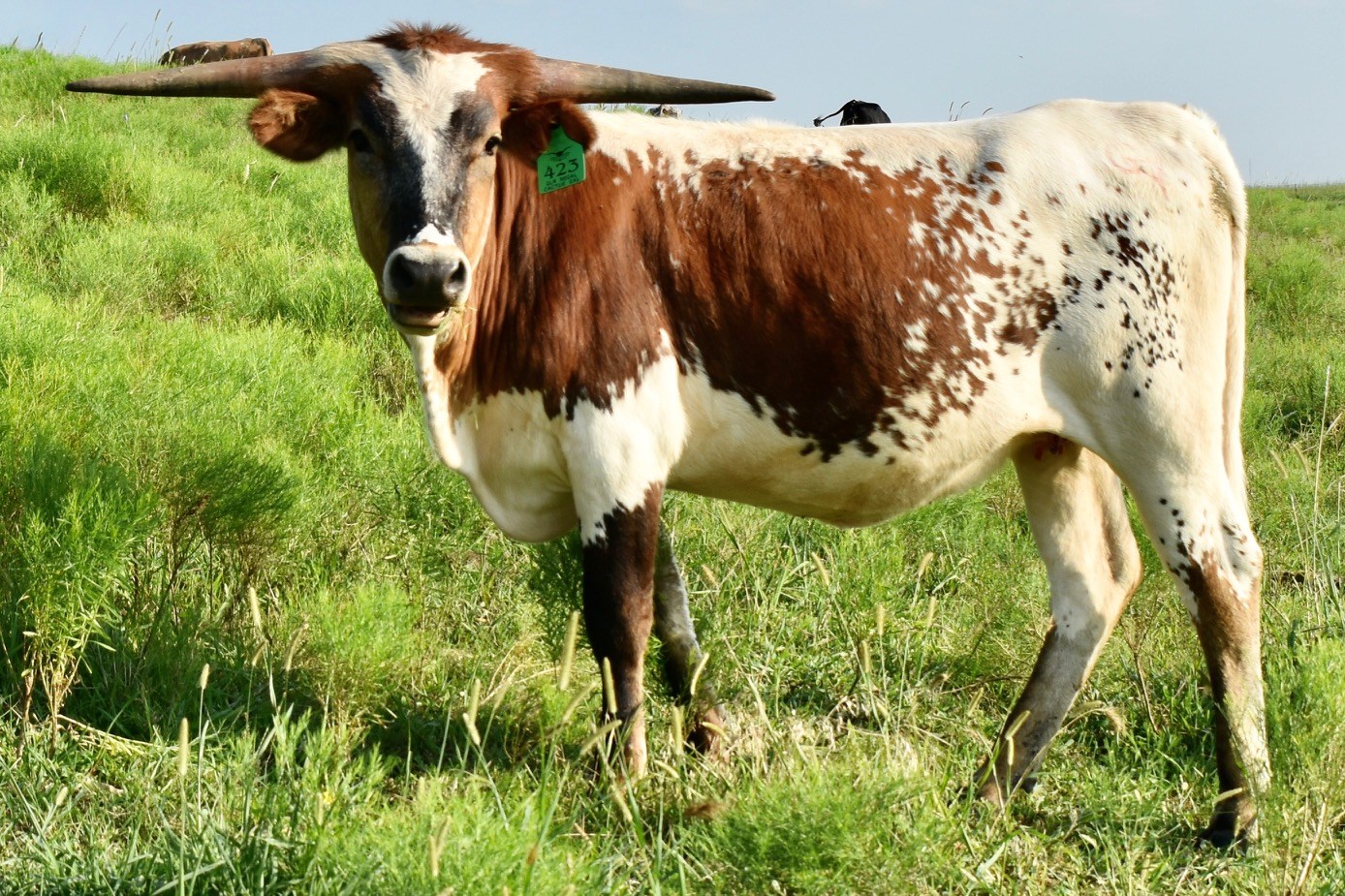 . PCC Cactus Jack is the sire to this female. He was special from the day he was born and he has only excelled since then.He has won multiple honors including the highly competitive 2023 Legends Grand Champion Bull and the 2023 and 2024 TLBAA Horn Show Case Ultimate bull. He is docile with a great disposition.He was 86’’ TTT on his 3rd birthday but he enjoys rubbing his tips on the ground and other objects which has limited his TTT henceforth.That doesn’t change the genetics to his offspring which typically have have great TTT horn with very striking color— something which equates to value in this industry. ( Pace/Gilliland/Manning/Loomis)
