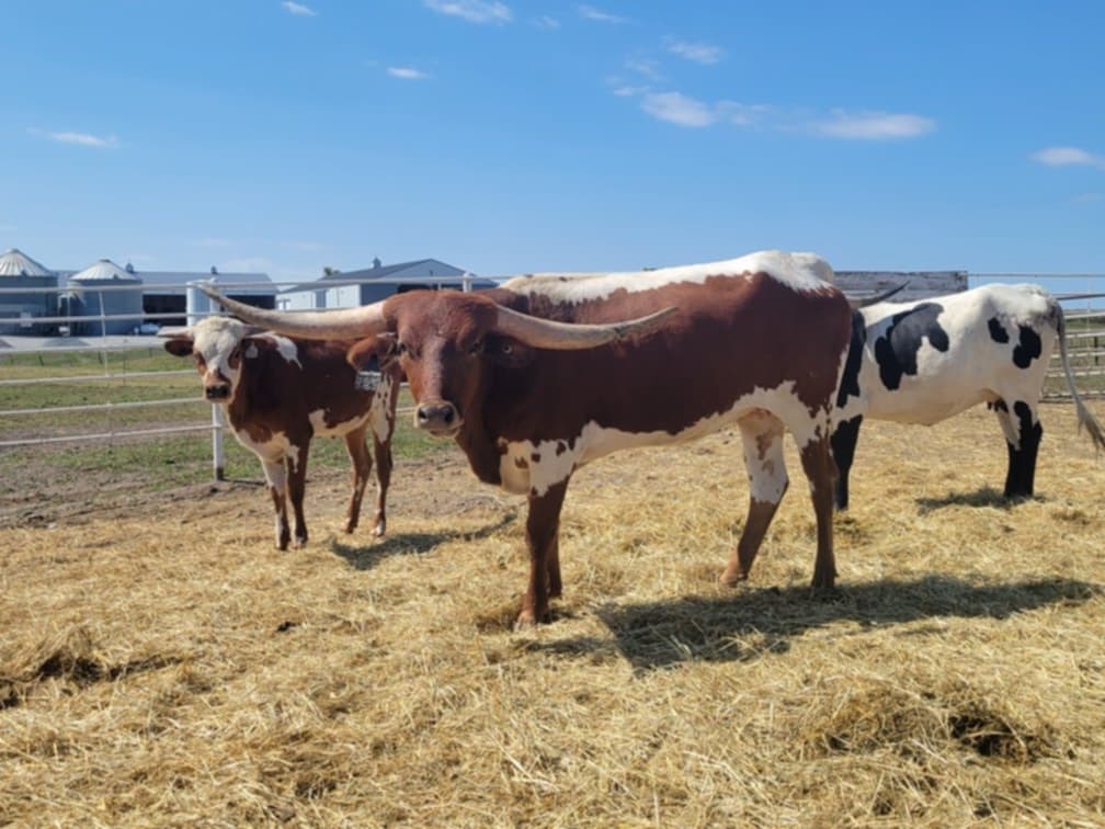 Look at the sway back horns on this girl! Delights is a Hubblles 20 Gauge daughter out of a Cowboy Catchit Chex daughter. This cross is very consistent and producing beautiful cows. She is a very correct and complete heifer that is going to have an amazing set of twisty horns!